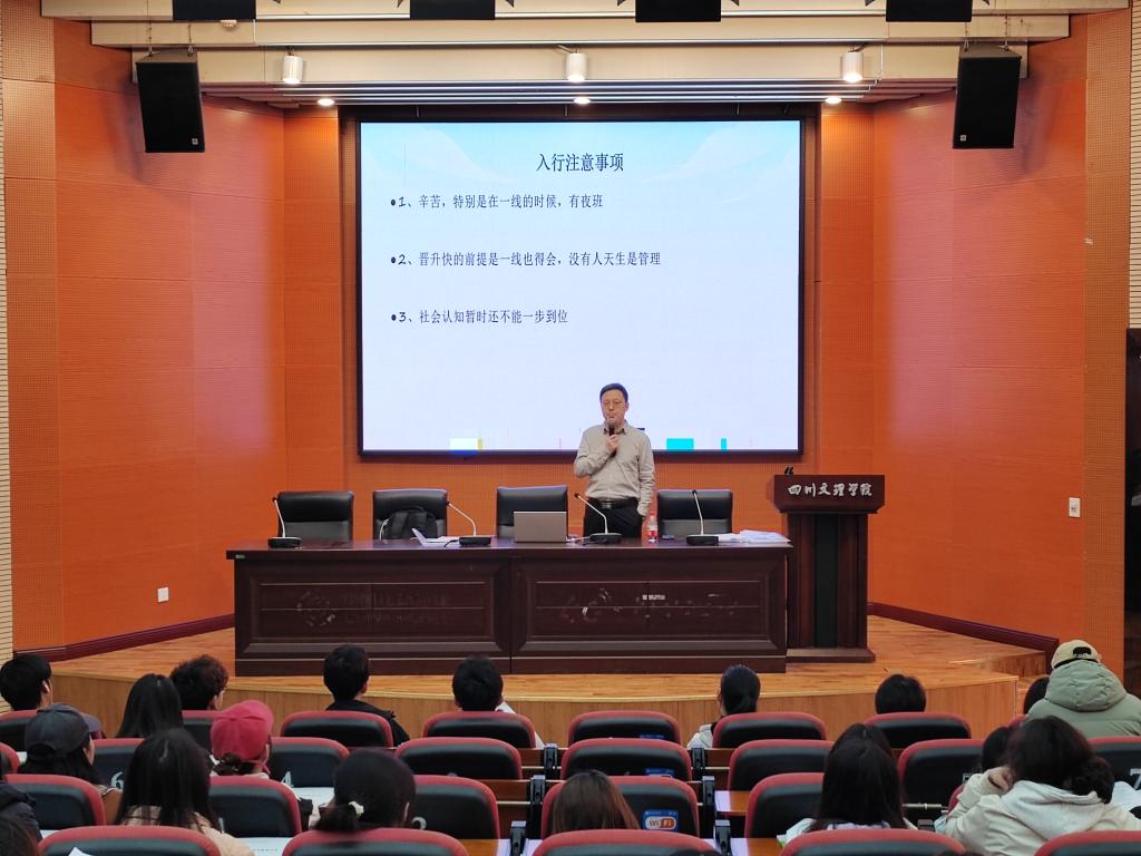 3月20日,澳门十大信誉好的网站、澳门十大信誉好的网站邀请四川华羽同创教育科技有限公司总经理吴平超在学术报告厅B厅为老年服务管理专业学生开展了就业专场讲座。学院学工办主任周宏星、兼职辅导员冯琴出席,2022级、2024级养老服务管理专业同学参与此次活动。