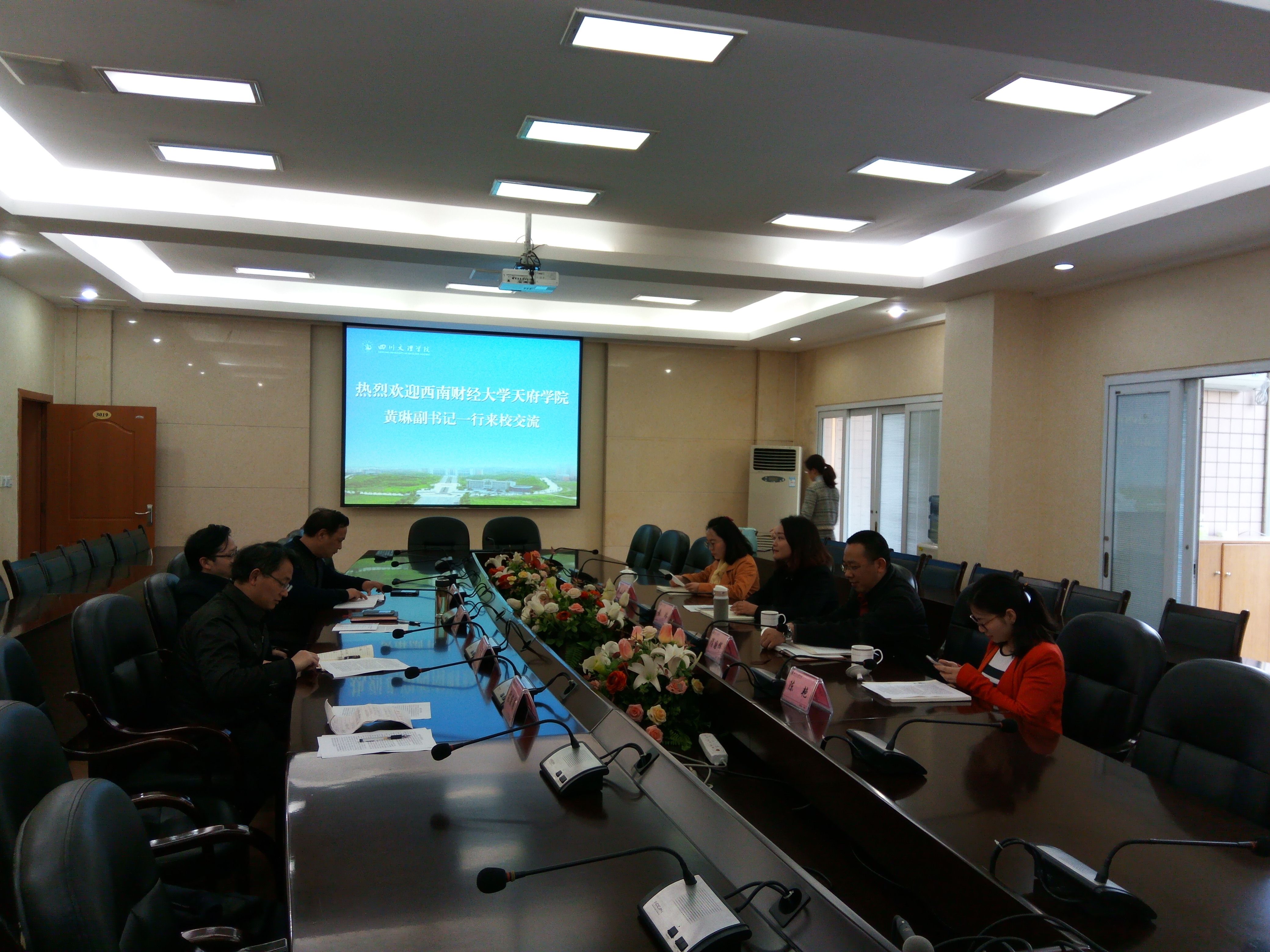 4月12日,西南财经大学天府学院黄琳副书记带领老年学研究所所长、副所长及专业负责人一行四人来我校交流并召开座谈会。我校党委副书记侯忠明教授、澳门十大信誉好的网站院长靳能泉教授、教务处副处长曾宪文教授及专业教师张俊蒲参加座谈。