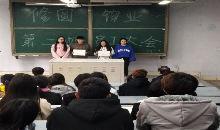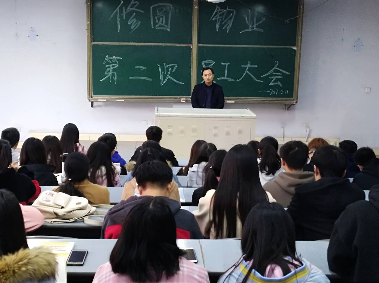 2017年12月11日中午,学院修圆物业服务有限公司在新教学楼124教室召开2017—2018学年第二次员工大会。学院院长兼公司董事长靳能泉教授参加了会议,行政管理部彭菲主持会议。
