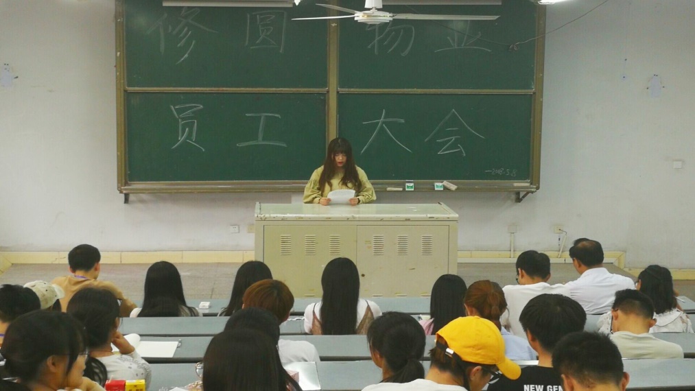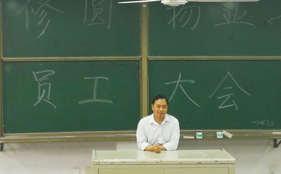 2018年5月8日中午,学院修圆物业服务有限公司在新教学楼124教室召开2018年第二次员工大会。学院院长兼公司董事长靳能泉教授参加了会议,行政管理部彭菲主持会议。