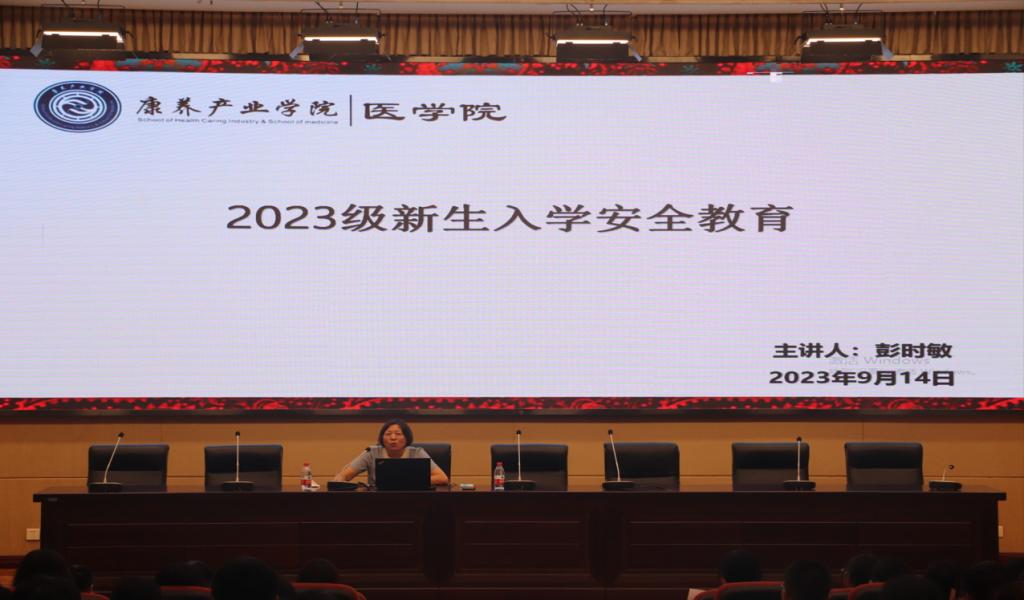 彭时敏作新生安全教育,围绕学生公寓用电安全、校园网络电信诈骗、人身财产安全、餐饮安全、体育安全及交通安全等各个方面,并结合大学安全典型事故和案例,对新生进行全方位的安全教育,提高学生安全防范意识和防范能力。