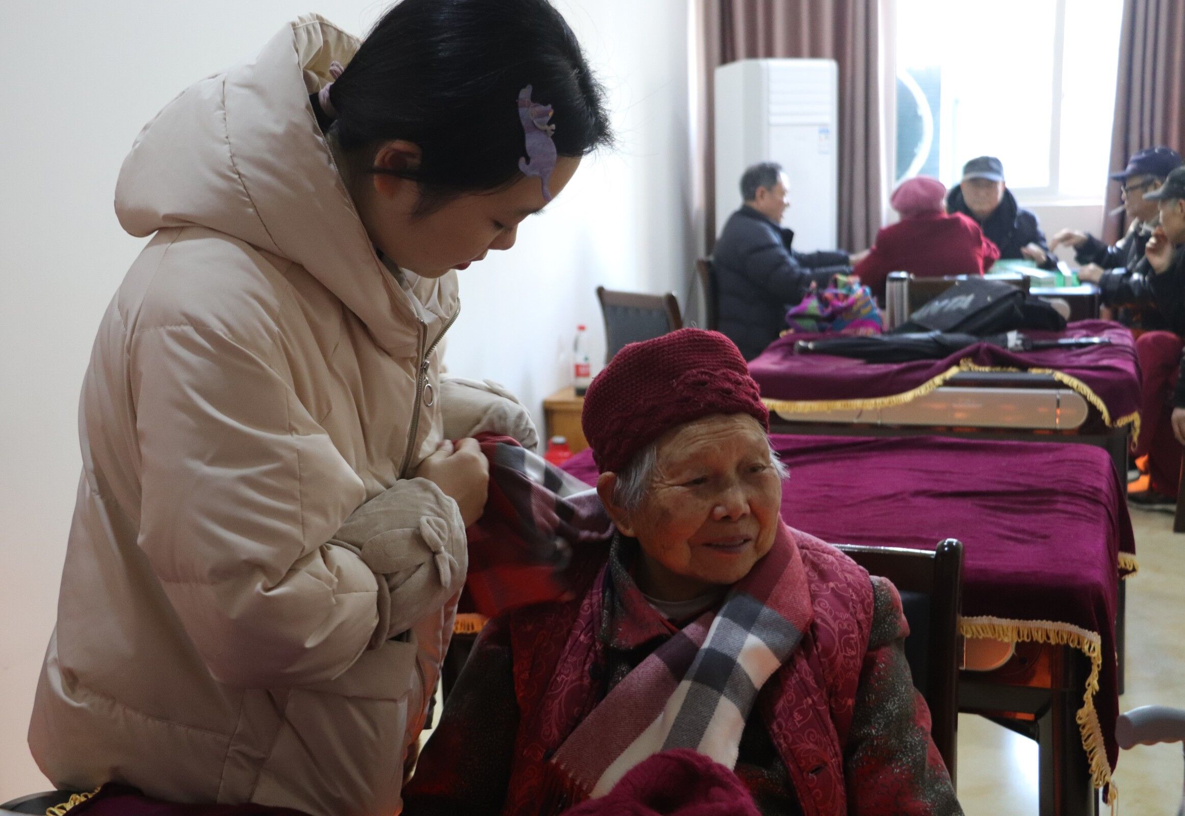 下午3点整,志愿者们到达养老中心,为每一位老人换上专门准备的新帽子、新围巾。在简单分工后,青年志愿者们开始积极与老人们互动,有的陪老人聊天、有的为老人整理房间、打扫卫生,还有的给老人捏腿捶肩。康养中心的老人对志愿者的暖心行动表示了赞赏和感谢。不知不觉中两个多小时的暖心陪伴转眼间就要结束了,青年志愿者与老人一一道别。