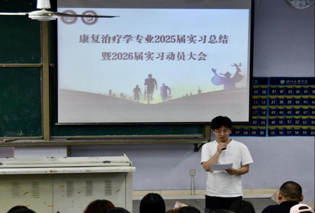 5月12日下午,学院在博文楼124教室顺利召开康复治疗学专业2025届实习总结暨2026届实习动员大会。学院党委书记彭时敏、医学教研室主任刘常燕、护理教研室主任叶盈、教科办主任刘孝英、教学秘书钟琳出席会议,专职辅导员谢佳佳、王馨彤及2025届、2026届康复治疗学专业全体学生参会,学院副院长张俊浦主持会议。