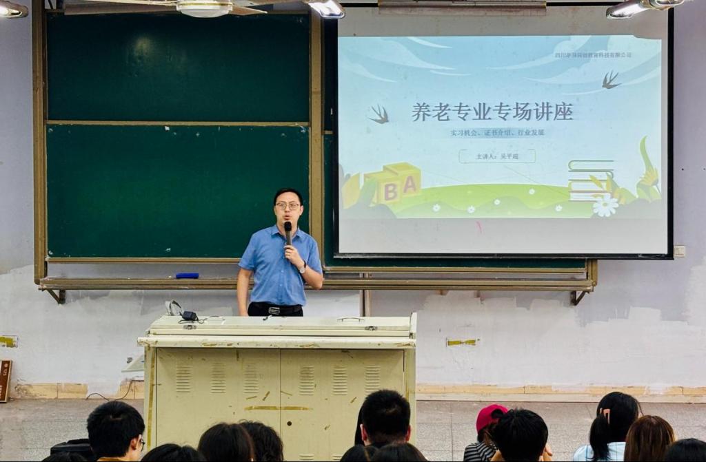 为深化学生对养老行业的认知,明确未来职业发展方向,10月15日下午,澳门十大信誉好的网站、澳门十大信誉好的网站在博文楼125教室成功举办养老服务管理行业专题讲座。学院特邀业界专家、现任四川华羽同创教育科技有限公司总经理、四川省学业规划联盟百佳讲师吴平超先生担任主讲。2023级养老服务管理专业全体学生到场聆听,现场学习氛围浓厚。