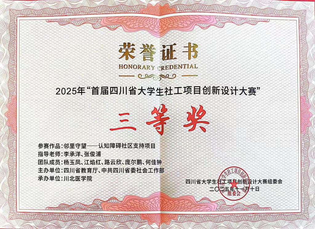 四川省大学生社工项目创新设计大赛是省级大学生学科竞赛重要项目之一。本届大赛以“社创赋能·共治共享”为主题,聚焦“特殊人群服务”、“医务社工”、“基层治理”、“乡村振兴”四大核心方向展开,旨在通过项目设计与实践,激发大学生关注社会现实、运用专业知识开展社会服务与治理创新的能力。十大信誉官网参赛队伍聚焦社区认知障碍老人及其家庭照顾者实际需求,设计具有针对性、可操作性和创新性的服务项目,为构建认知友好型社区提供可复制、可推广的本地化实践模式。该项目生动诠释了大赛主题,展现了同学们敏锐的社会洞察力和良好的团队协作与创新能力。